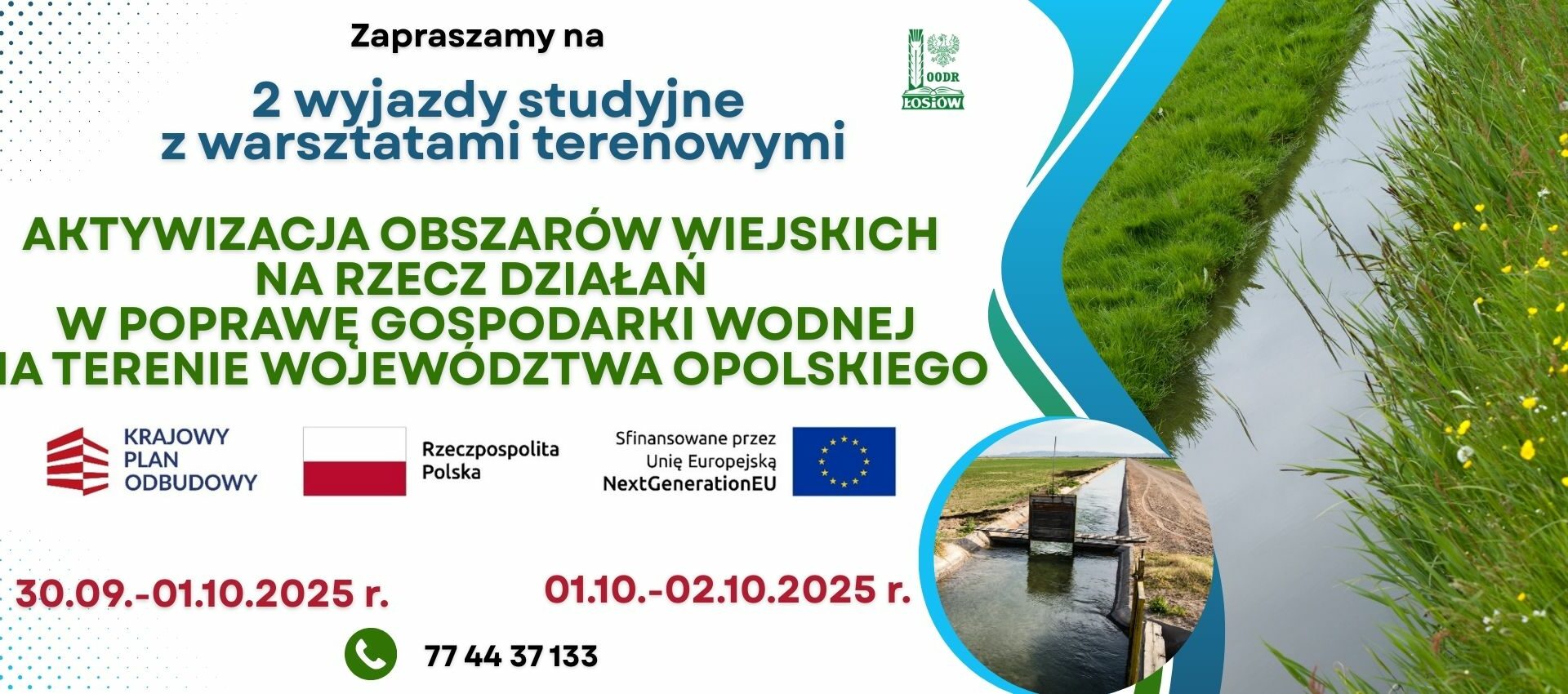 Zapraszamy przedstawicieli LPW na 2-dniowe wyjazdy studyjne  z warsztatami terenowymi do województwa wielkopolskiego, realizowane  przez Opolski Ośrodek Doradztwa Rolniczego w ramach projektu pn. „Aktywizacja obszarów wiejskich na rzecz działań w poprawę gospodarki wodnej na terenie województwa opolskiegoobjętego wsparciem w części pożyczkowej z Krajowego Planu Odbudowy i Zwiększania Odporności (KPO) w ramach obszaru A inwestycji planu rozwojowego B3.3.1 pn. „Inwestycje w zwiększenie potencjału zrównoważonej gospodarki wodnej na obszarach wiejskich”.