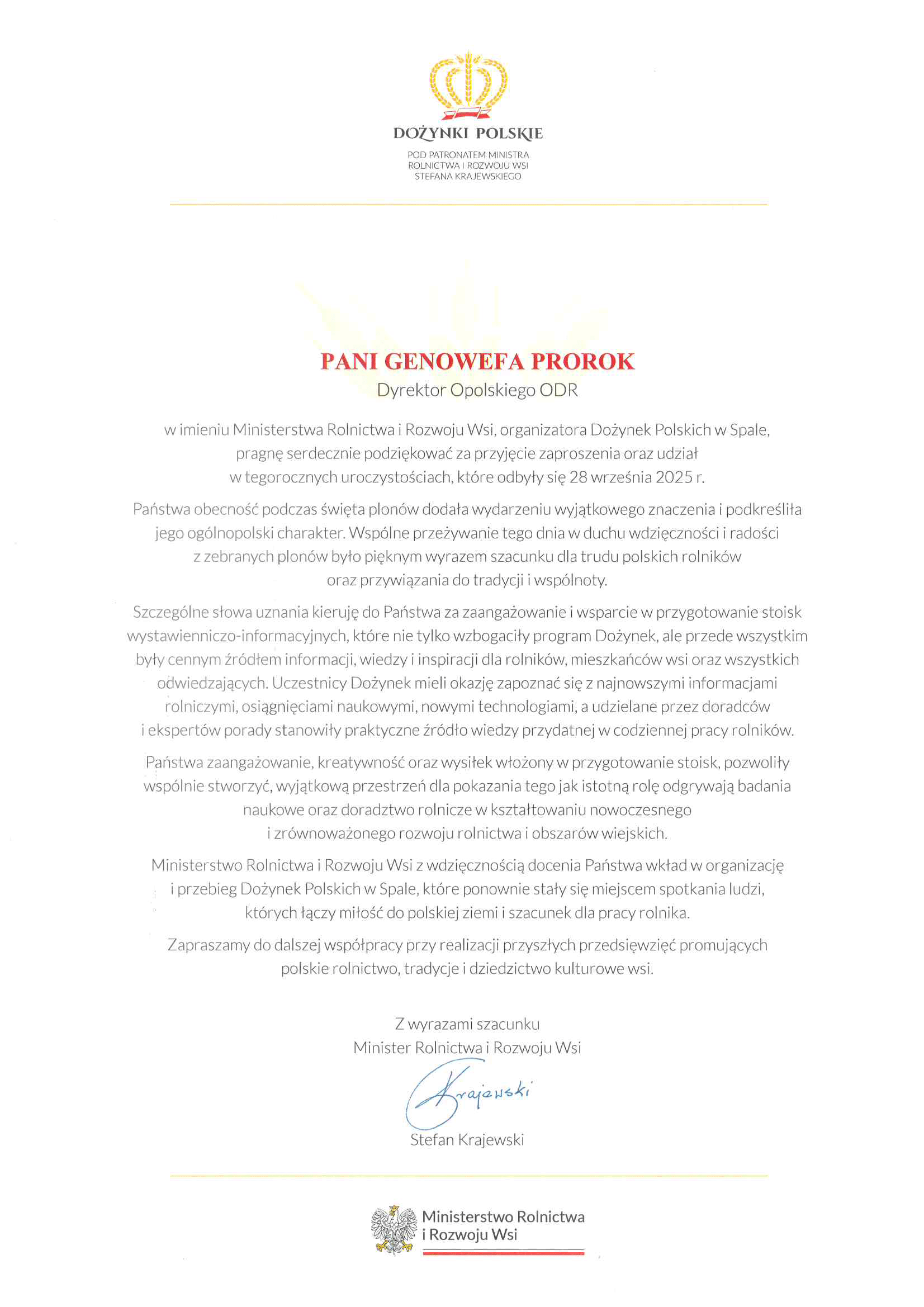 List z podziękowaniami od Ministra Rolnictwa i Rozwoju Wsi Stefana Krajewskiego skierowany do Pani Genowefy Prorok, Dyrektor Opolskiego Ośrodka Doradztwa Rolniczego, za udział i zaangażowanie w organizację Dożynek Polskich w Spale w 2025 roku.