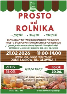 W każdą trzecią sobotę miesiąca na terenie OODR w Łosiowie – w namiocie wystawowym przy pałacu będziecie Państwo mieli okazję kupić produkty bezpośrednio od producentów, bez pośredników, z gwarancją jakości i prawdziwego pochodzenia.