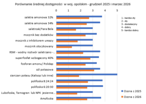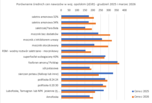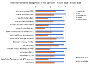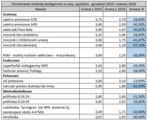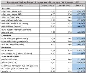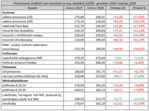 Najbardziej przewidywalna sytuacja dotyczy nawozów azotowych. W tej grupie dominują jedne z największych spadków dostępności przy jednoczesnym wzroście cen, wynikające z drożejącego gazu, ropy, transportu, a także zakłóceń w dostawach. W porównaniu zarówno rocznym jak i z końcem grudnia 2025 ceny wzrosły od kilku do ponad 40%. Spadek dostępności w tej grupie sięga ponad 66%.