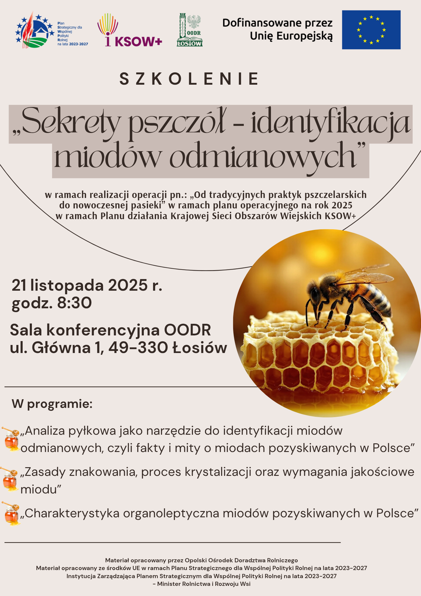 – identyfikacja miodów odmianowych” w ramach realizacji operacji „Od tradycyjnych praktyk pszczelarskich do nowoczesnej pasieki” w ramach planu operacyjnego na rok 2025 w ramach Planu działania Krajowej Sieci Obszarów Wiejskich KSOW+: