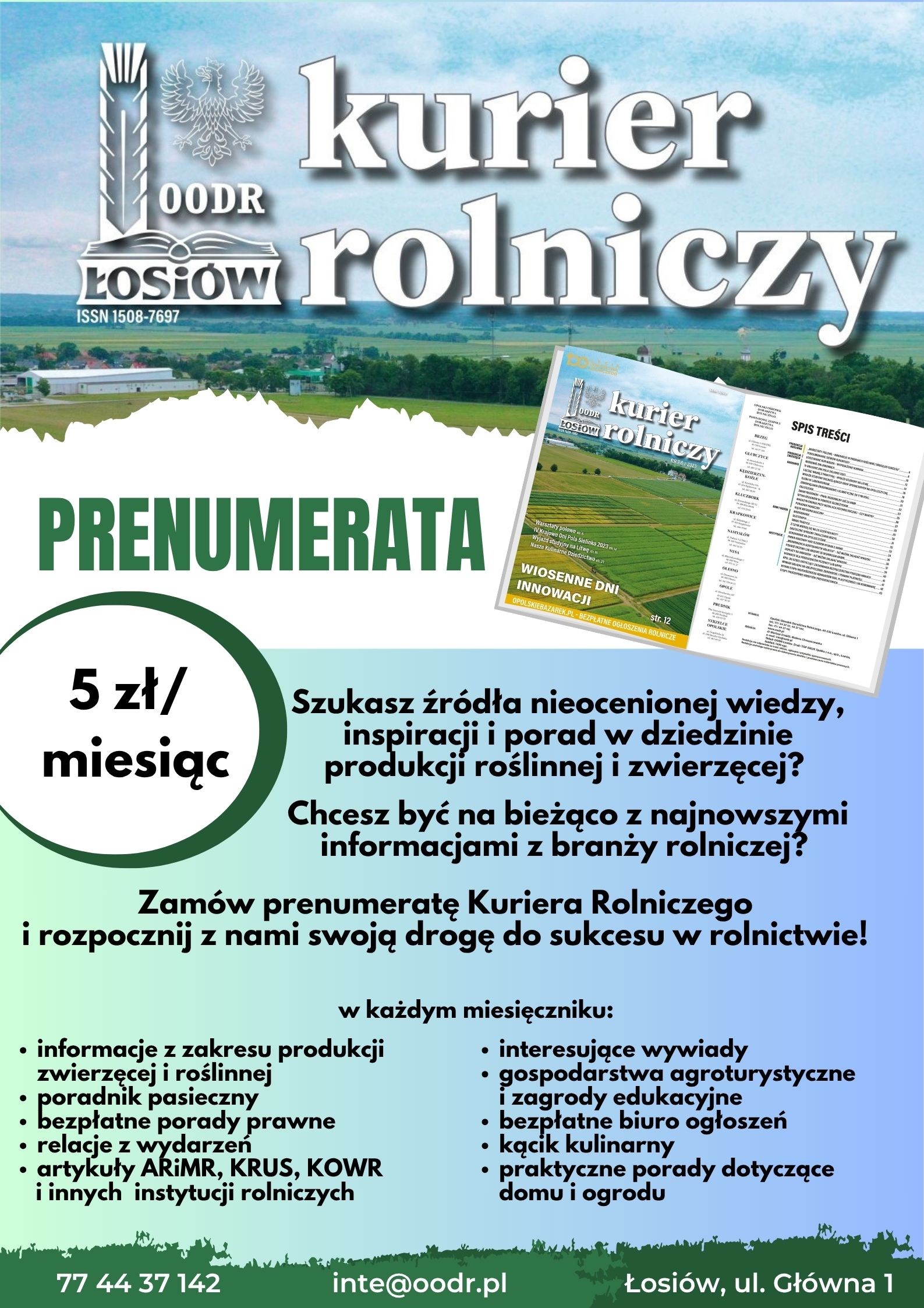 Opolski Ośrodek Doradztwa Rolniczego w Łosiowie od wielu lat wydaje miesięcznik Kurier Rolniczy – czasopismo tworzone z myślą o rolnikach, mieszkańcach obszarów wiejskich, samorządach oraz instytucjach wspierających rozwój rolnictwa. Serdecznie zachęcam do prenumeraty.