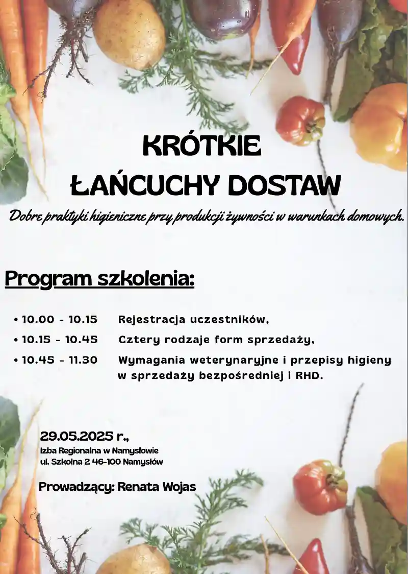 Serdecznie zapraszamy wszystkich zainteresowanych do udziału w szkoleniu, poświęconym krótkim łańcuchom dostaw oraz dobrym praktykom higienicznym w domowej produkcji żywności.